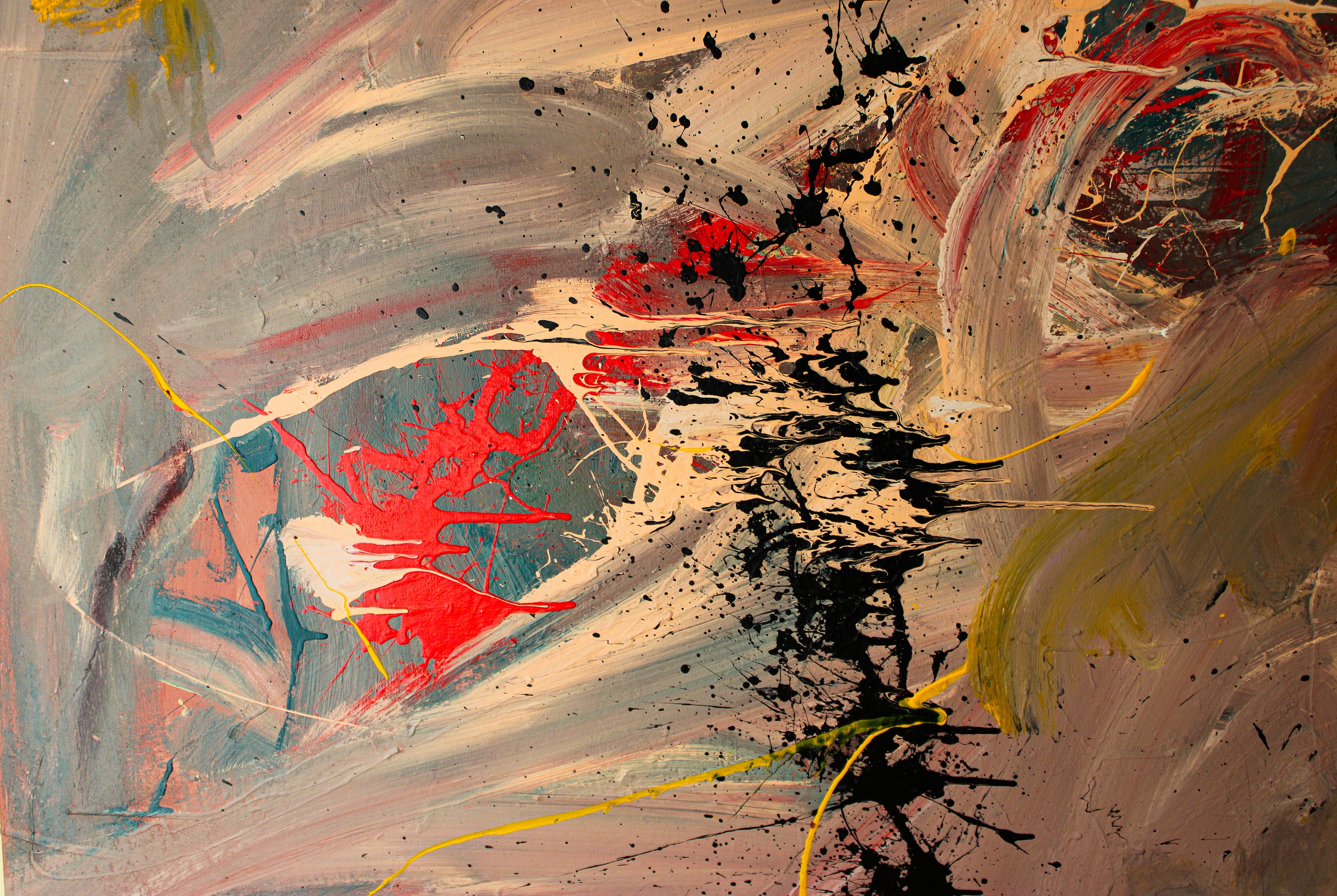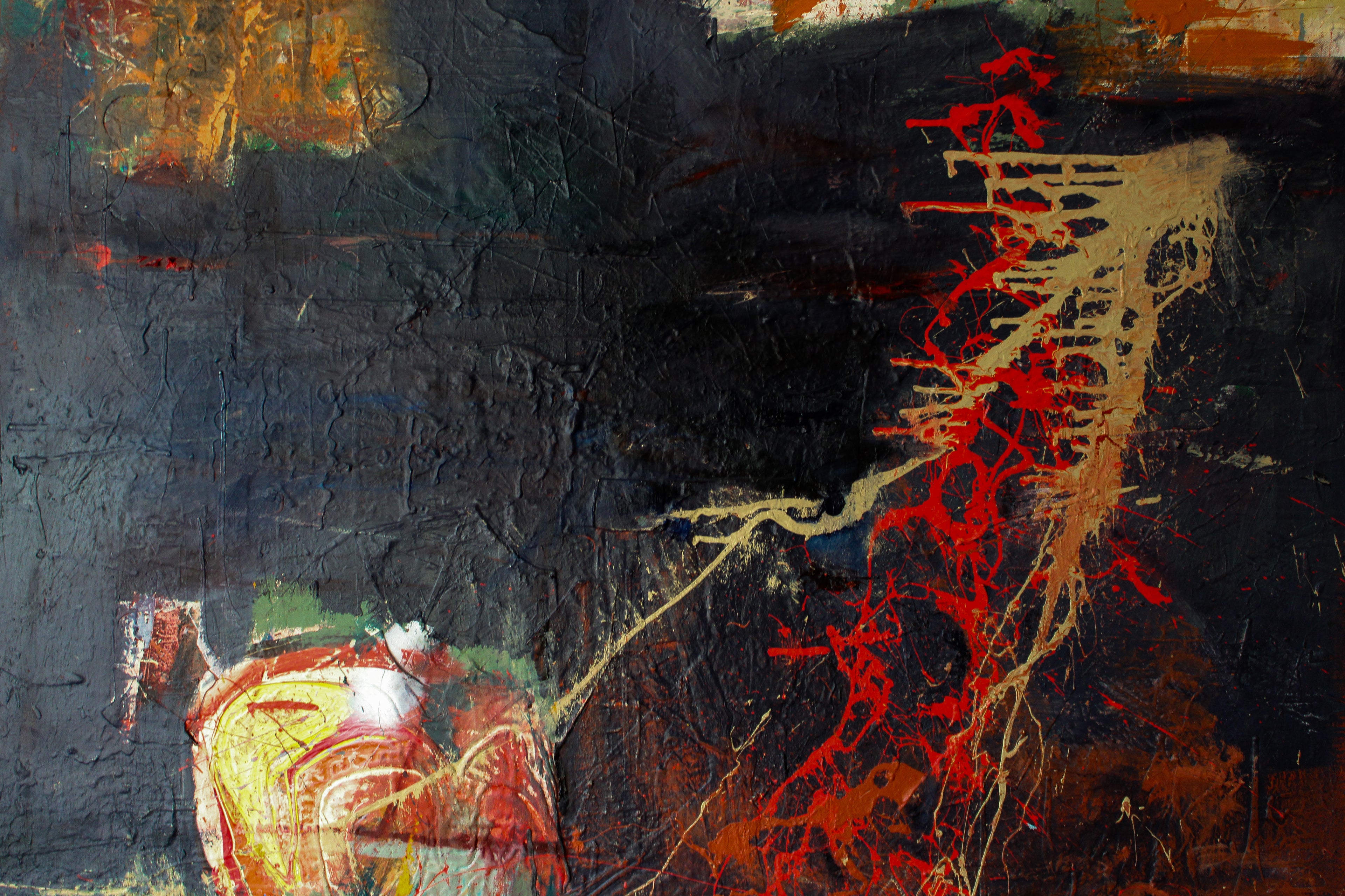 Acrylic, oil, oil-stick, spray, ink block-print, color pencil, markers, ink and collage on canvas