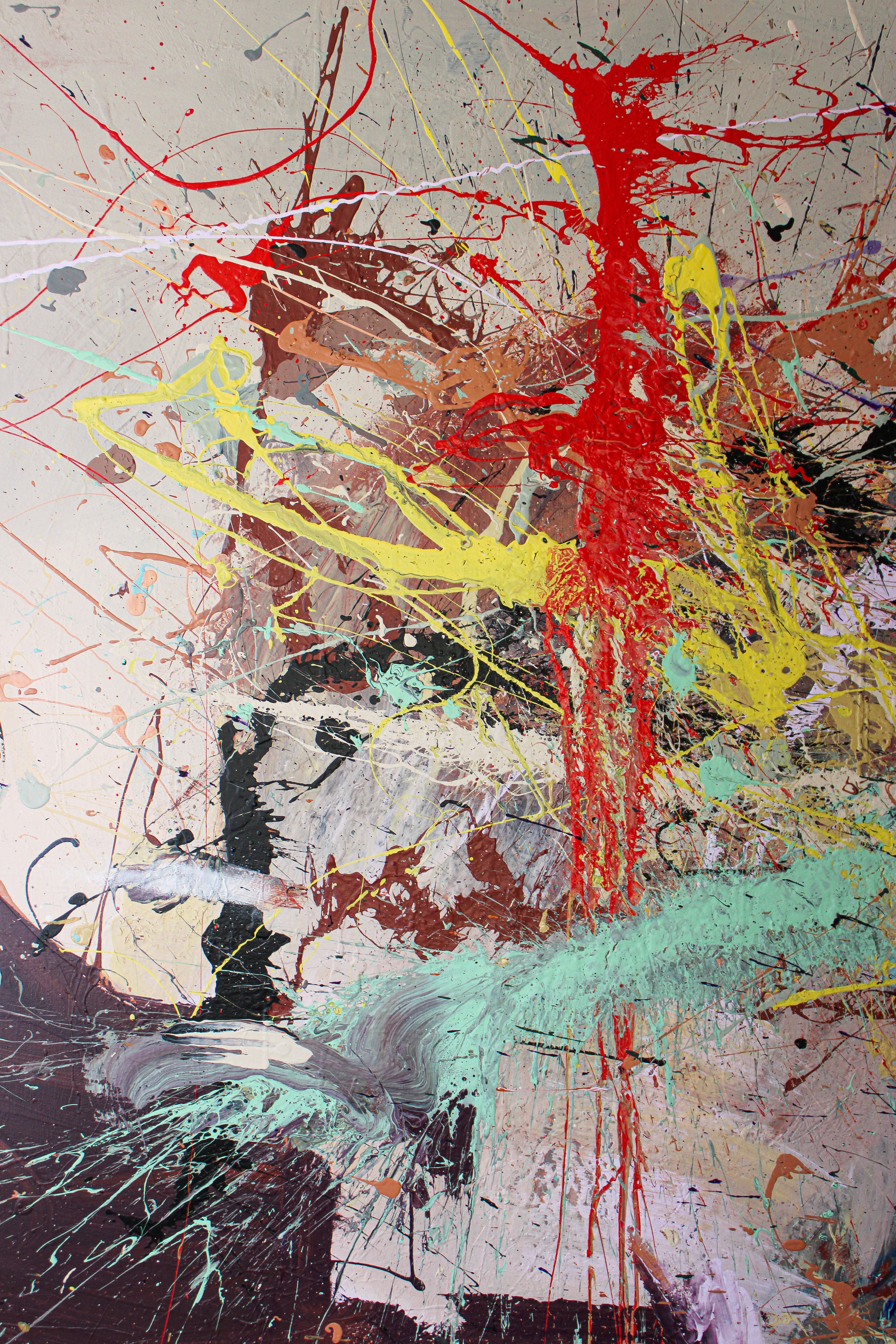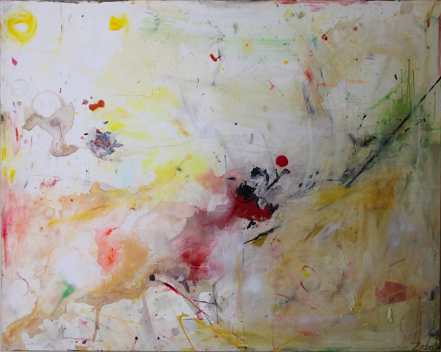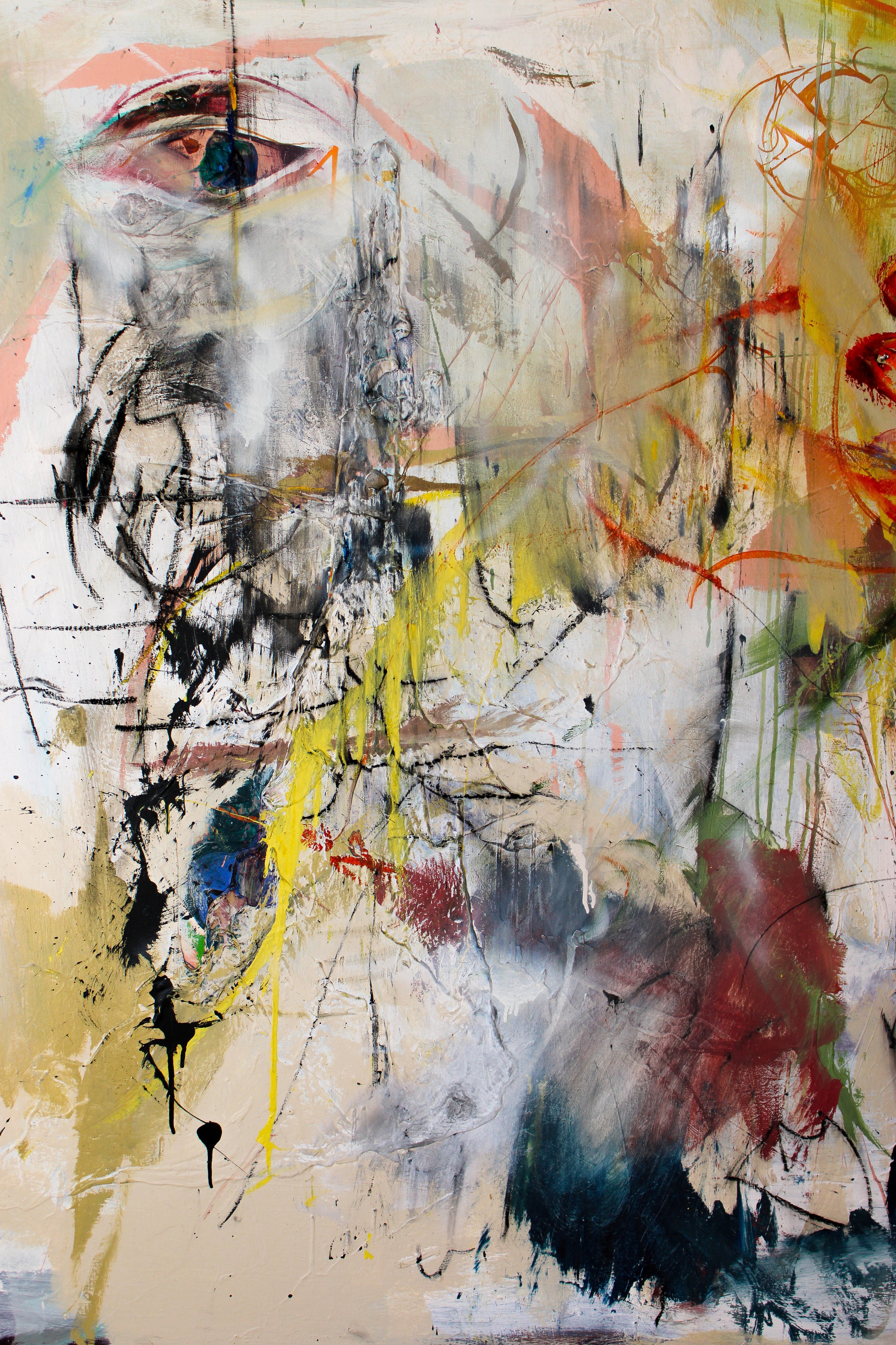 Acrylic, oil, oil stick, spray, gesso, color pencil, charcoal, graphite, markers and collage on canvas